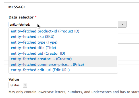 While working on standardizing the tokens exposed by Drupal Commerce, we found an inconsistency in the Rules UI between "Data selection" and "Direct input mode":