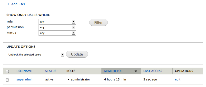 The administration toolbar's people link provides you with a list of all user accounts registered on your website. (See figure 2.1) The list of users shares many features with the content list. There are links to view and edit each account, and there are tools for filtering and mass updating accounts.