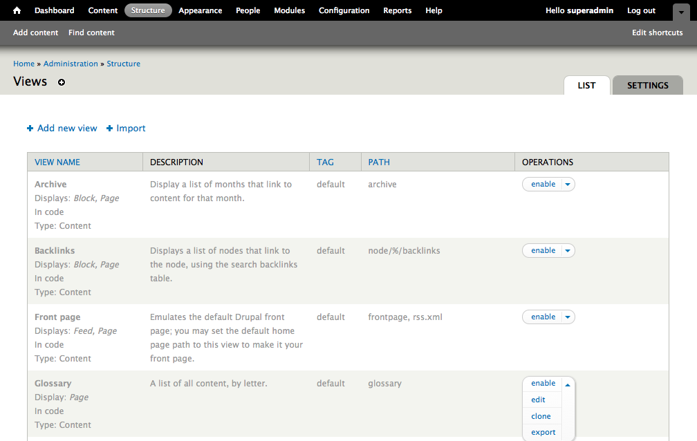 The overview page for the Views module is found at the toolbar, Structure, Views. It contains a list of all views available on your website. With Views comes a number of pre-configured default views that you can enable. Some of them include Archives, Backlinks, Front Page, and Glossary, which can be seen in Figure 9.1