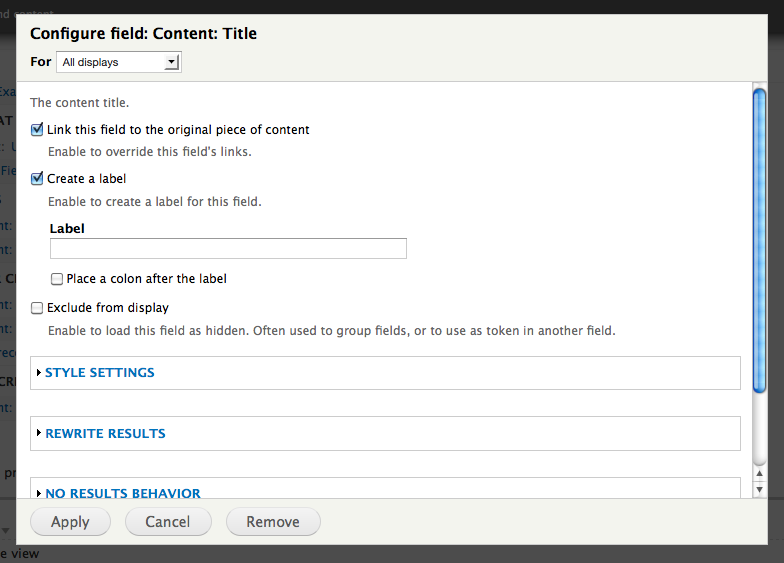 - Edit the title field added by Views by default. Add a label title, to provide the related table column with a header. (See configuring view fields.)