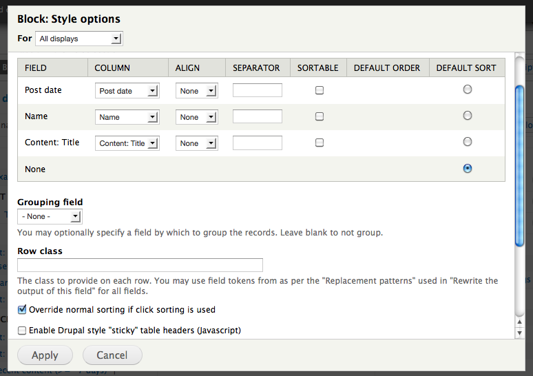 Figure 9.16: Each view format may have a number of format-specific settings. These are the settings for the table format, including click-sortable columns.