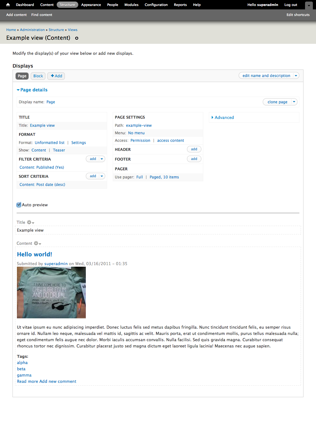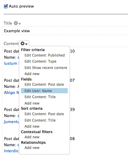 At the bottom of the Views main configuration panel is a preview of the view content, showing that your settings work as intended. It is also possible to use the preview to change most of the settings in a view. Clicking any of the gear links will display menus to change most of the view's configuration. (See figure 9.19)