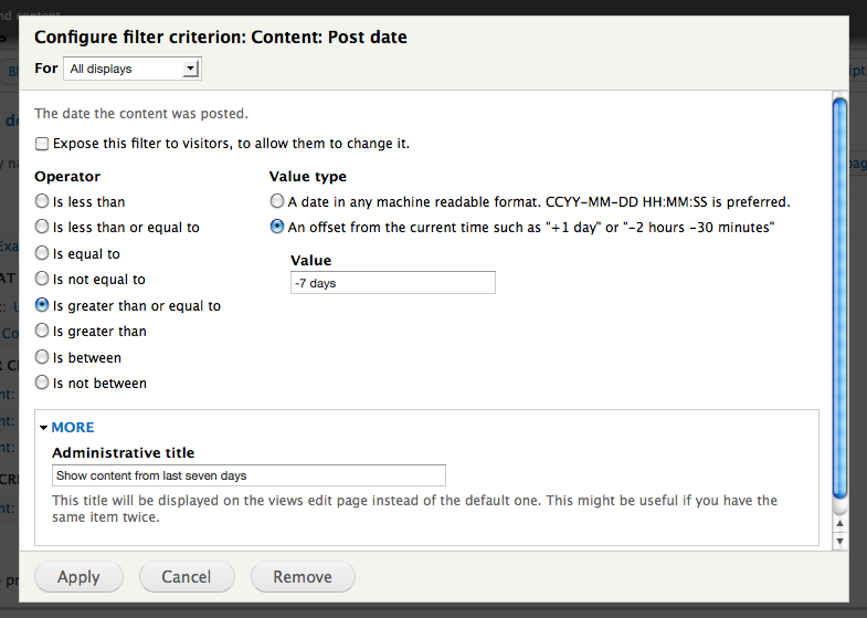 The filter settings contain two options that are described in separate sections. The checkbox expose this filter to visitors, to allow them to change it is explained in the section about exposed settings. The option configure […] for all displays in the dialogue head makes it possible to have different settings between (for example) pages and blocks for the same view. See the section about displays for details.
