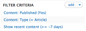 - Another filter content: post date is added, configured to only display nodes posted the most recent week.