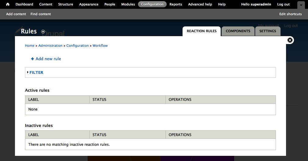 The administration pages for Rules are found at the toolbar, Configuration, Workflow, Rules. The landing page is used to manage reaction rules, a good starting point when learning how Rules are used. (See figure 12.1)