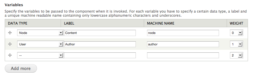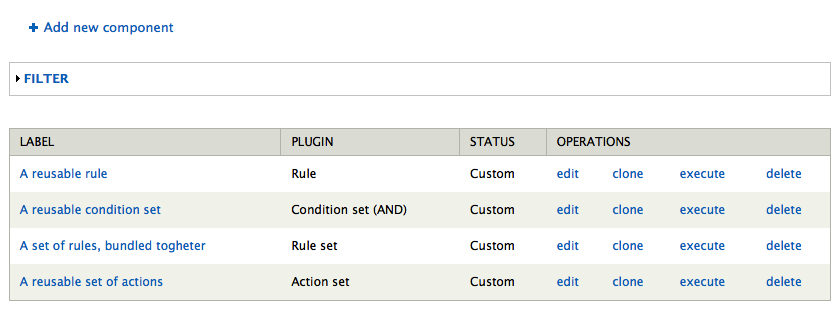 Components are not only useful for reusing configurations, but also for exporting Rules configuration efficiently. See the section on configuration export in Appendix 1 for details about why configuration export is so useful.