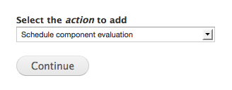 Scheduling tasks with Rules Scheduler is done by adding the action -schedule component evaluation, available as other actions in the Rules interface. (See figure 12.11) At the resulting page you choose a component of the type action set, rule or rule set. (See figure 12.12)