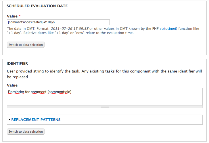 - Times specified by offsets. The offsets may be combined with tokens or static times (such as [comment:node:created] +2 days). There are many ways of specifying offsets – for example +1 Monday will give you the nearest following monday.