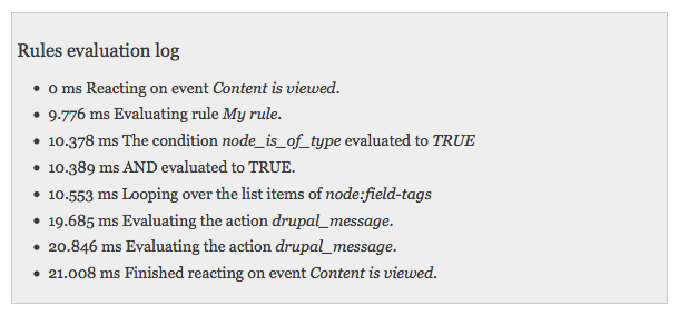 TIP: The Rules debug information also shows a time stamp for each step in the evaluation. This information can help you spot unexpected heavy operations.