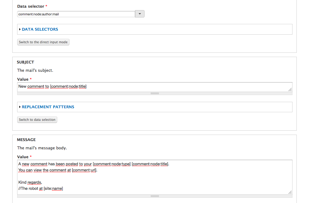 - Add an action send mail. Set the to field to [comment:node:author:mail] (using data selection), the subject to new comment on [comment:node:title] and make sure to include the [comment:url] replacement pattern in the message to have a link to the comment. Leave the from field empty to use the site default e-mail address.