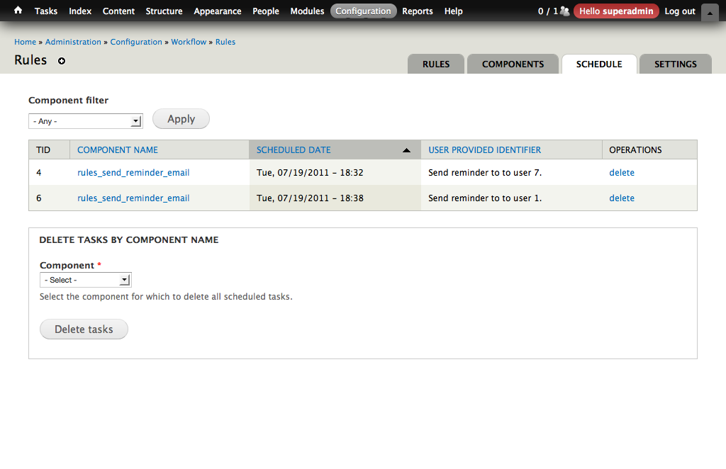 - Go to admin/config/workflow/rules/schedule and verify that a reminder e-mail has been scheduled to be sent out to the administrator in one month.