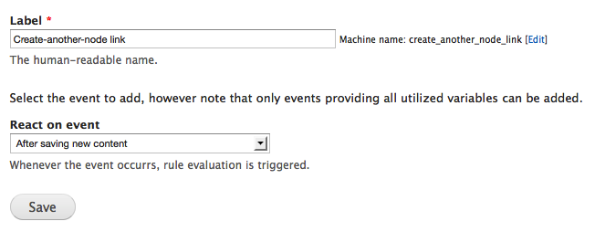 - Label: This is the administrative title for the reaction rule. A machine name will be suggested based on this name.