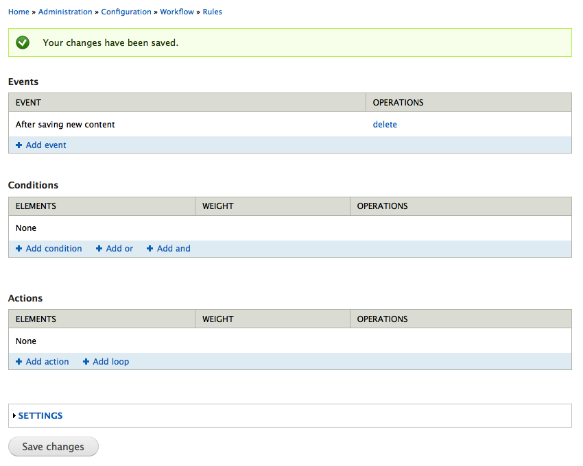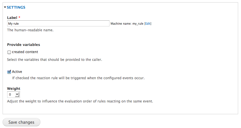 Figure 12.8: The settings fieldset contains more settings, for example allowing you to change the name of the reaction rule.