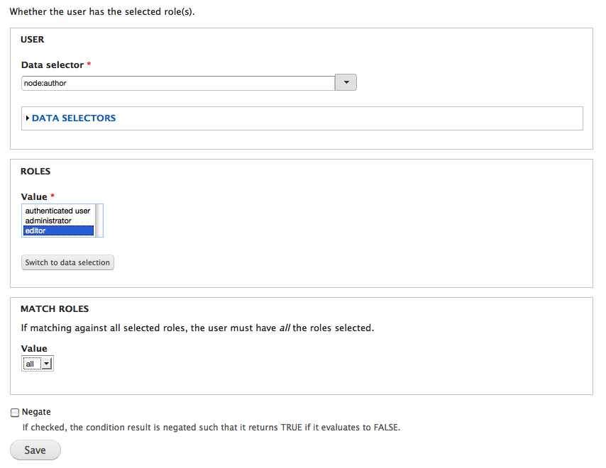 Figure 12.4: The settings for each condition vary depending on the data managed by the condition. Here is a condition used for evaluating a user's roles.