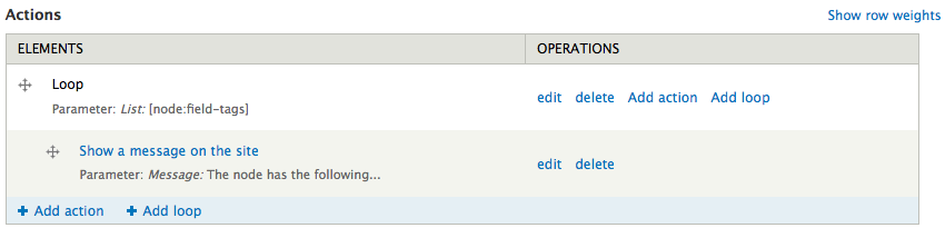 Next to the link for adding actions is a link with the title add loop. Loops may be used when an available variable has multiple values, to carry out one or more actions for each value in the variable. This could, for example, be used to send e-mail messages to all users listed in a user reference field. (For this to work, the multiple-value variables must be exposed in a way that Rules can interpret, which is not currently the case for user reference fields.)