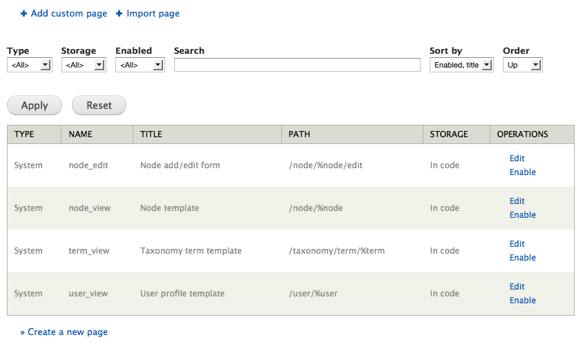 TIP: Page manager allows you to override a number of paths defined by other modules, in a standard Drupal installation this is node view, node edit, user view and taxonomy term lists. These overridden pages are managed almost identically to other, manually defined, custom pages. The differences are pointed out below.