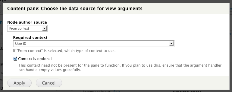 - Add a content pane display to the view. Change the argument input settings to from context, fetching a content ID from a node available as context.