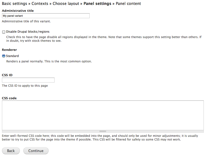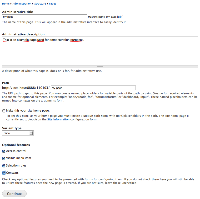 - Variant type: This option decides how the content of the custom page should be provided. Page manager provides the option HTTP response code, while the Panel option, not surprisingly, is provided by the Panels module. This setting cannot be changed once the page is saved.