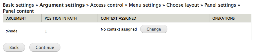 If the custom page path includes optional or required keywords (!keyword or %keyword, respectively), Page manager can use the values provided in the path to load contextual objects (covered later on in this book). A click on the change button at context assigned opens a dialogue where you can specify how Page manager should interpret the provided path argument. In most cases, the path arguments are numeric IDs used to load the corresponding node, user or taxonomy term, but other options are available, too. You are also provided an opportunity to give an administrative name (context identifier) for the object loaded from the path argument.