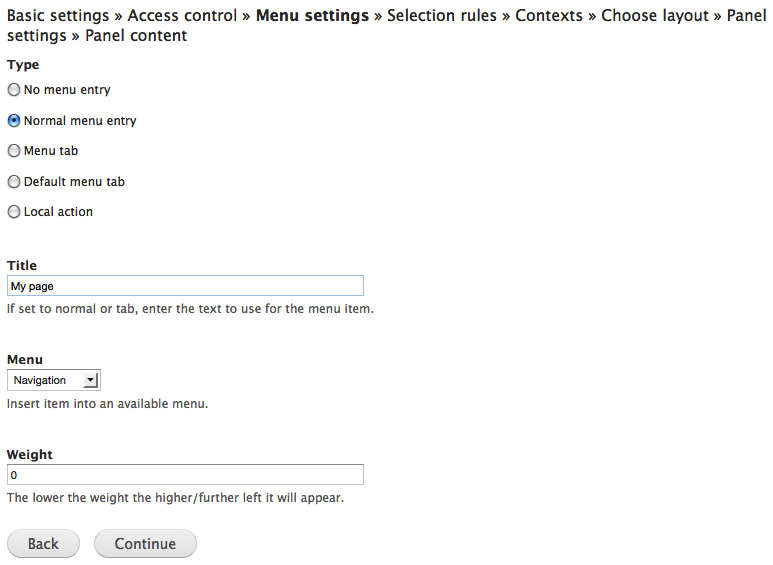 The available menu settings in Page manager are close to identical with the ones found in Views (see figure 13.5). See the description in the second Views chapter for details. Page manager has one more option for menu items, though, local action. Local actions are similar to tabs, but are (in a standard installation) displayed with a plus sign and a link right above the main content. Also, while Drupal requires two menu tabs for displaying them, even solo local actions are displayed.