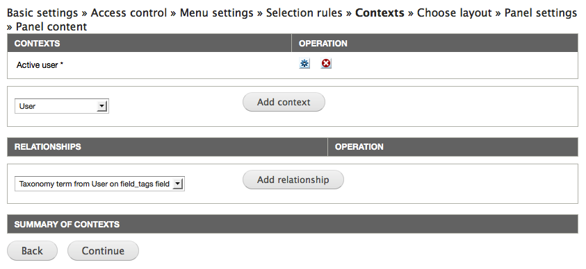 - By relationships to existing contextual objects, such as the vocabulary for a loaded taxonomy term, or the author of a given node. This is the most common way of adding contextual objects.