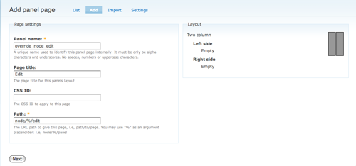 - Click Panel pages (Administer > Panels > Panel pages). At the top of the page, there are some tabs: click the 'Add' tab, which will bring you to a selection of possible panel layouts. Let's select a 'Two Column' panel.