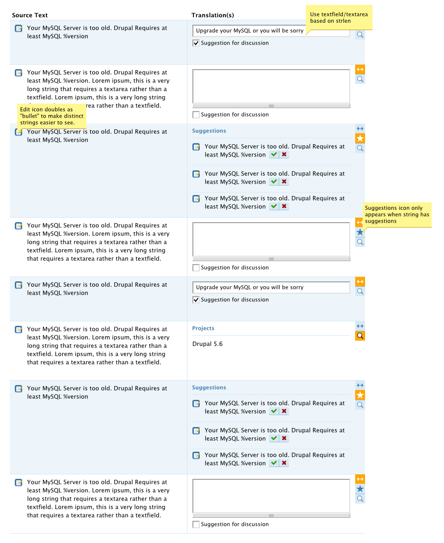 The ultimate goal is to keep this as simple as possible, and even make it simpler if we can do that :) Your mockup really shines in that it makes the translations more compact, and working on string quicker without less scrolling with more overview.