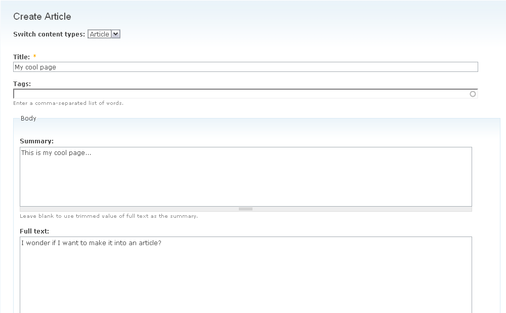 If a user starts out creating a page, they might not be too sure exactly what the difference is between, say, a page and an article. The user may thus be hesitant to commit to creating a page when they might actually need an article. This patch adds a select list to the top of node forms that allows users to switch node form through AJAX. This is useful because not only can users see the differences between the various forms easily, but they can start creating a page, and then switch to an article on the fly if they decide that would better suit their purposes. The content is transferred to the extent possible from one node form type to another, and all data is preserved for the case that the user decides to switch back to the original form. This patch will not make any difference for browsers without javascript or with javascript disabled. A series of screenshots below:
