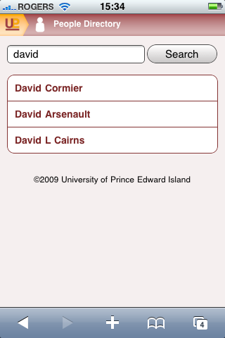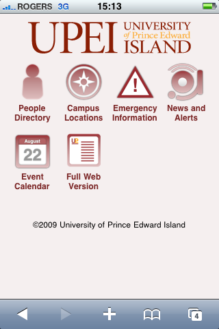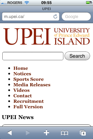 The main page (redirected on smartphones from http://upei.ca/ to http://m.upei.ca, a separate multisite installation that gathers feeds from around our installation) has a logo, search box and list of eight links on it. We went for a simple clean design that would hopefully work on as many browsers as possible: