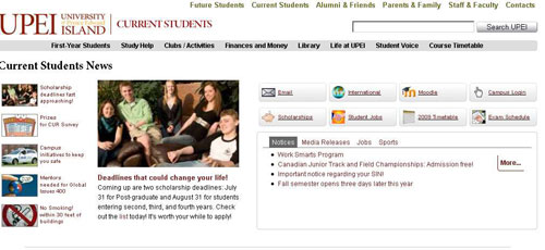 The upei.ca that the world sees is (mostly) copied from our Drupal server to our externally accessible server using httrack – which gives us a static copy of Drupal to serve out to the world and added security. We proxy through any of the content (say comments on a blog) that needs to be accessing database content. Our theme grew out of the excellent NewsFlash theme by RoopleTheme (Thanks, Bill) and has now become fully custom coded. We have a few custom modules, some for theming and some for integrating with XML exported from our UIS, but for the most part we are using core and standard contrib modules combined with template files and some increasingly nifty CSS to get our work done.