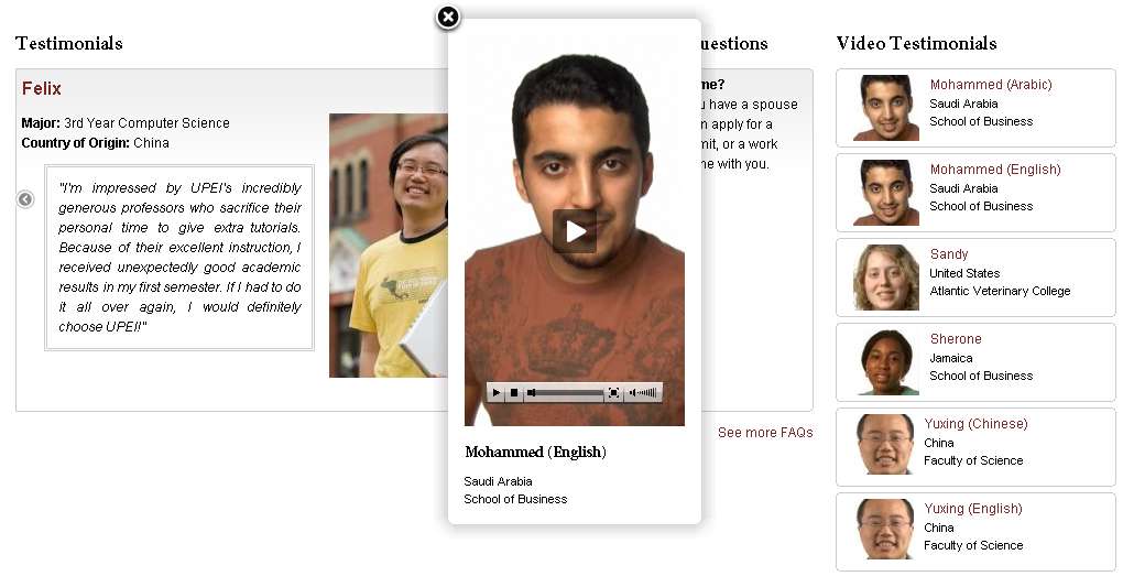 There are a number of different items that appear below the fold. We've not been as stringent in standardizing this content. These are sometimes departmental descriptions, FAQ boxes, profiles of students, and video (the video player on http://upei.ca/futurestudents/international is one that we are particularly proud of.). We've given our clients a fair amount of flexibility here, but are trying to maintain a 50%, 25%, 25% layout wherever possible. These are simply block locations that are fed via Views - Block: