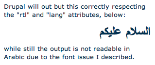 <body>which does not support Arabic.OF course this approach will require Arabic users to make sure they use lang="ar" in their posts in order for Drupal to display them correctly.