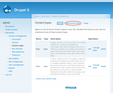 To add a content type, browse to Administer > Content management > Content types, and click on Add content type.