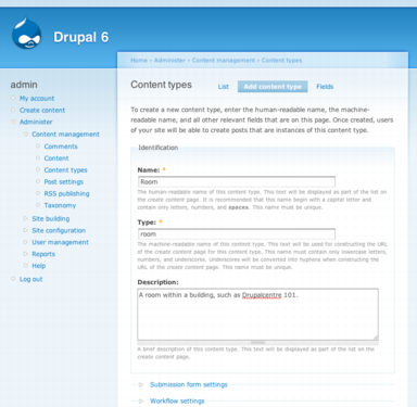 Set the name of the content type to Room, and the machine-readable type to room. Fill in a description of the content type to make it easy for users entering content to know what the content type is for.