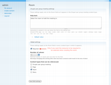 After adding the basic field information, enter appropriate help text for the field. Under Global settings, choose if a room should be required to be selected for an event. As well, it is best to limit the content types that can be referenced to Room, otherwise users can select any type of node.