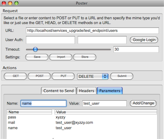 - Click the Parameters tab. This is where you enter the data to be submitted, which mimics the fields that would be posted from a web form. This data is entered in kay/value pairs. For a user these value are