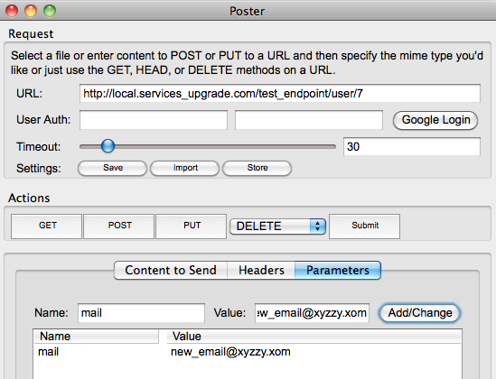 So in the above example, you can see in the response dialog that the UID of our new user is 7. So we can add this into our URL, and perhaps we want to change the user's email address as demonstrated below.