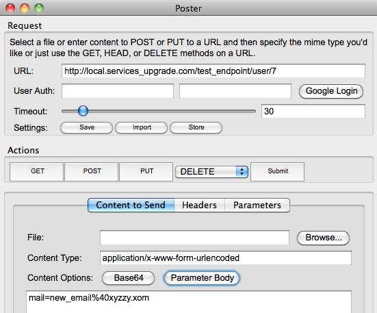 - Now click back to the Content to Send tab and click Parameter Body. This will convert your Parameters to properly encoded data, and change the Content Type to 'application/x-www-form-urlencoded'.