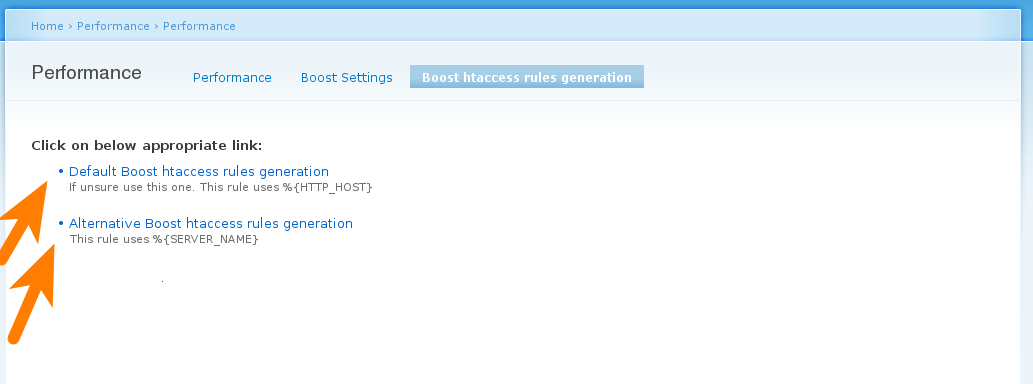 If user click on 'Default Boost htaccess rules generation' link the next page would be as follow. This is the already existing page.