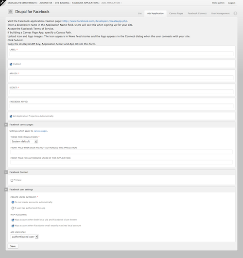 Note: If (a) you have more than one application enabled under Admin >> Site Building >> Facebook Apps, and (b) one of those apps is Facebook Connect (as opposed to just canvas pages), then the 'fb_apikey' in settings.php (in directory /sites/default) should be changed to the api key for the Facebook Connect application. Otherwise, you will get an error after you save the application. To see an example of this error message and the corresponding fix, please read the Troubleshooting page.
