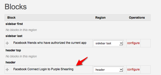 Now you need to confirm that your new Facebook application works so go ahead and enable the fb_connect block under /admin/build/block which looks like this: