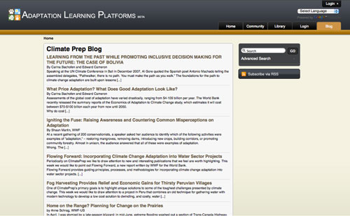 The portal’s other focus is research and information. It features a library that stores case studies, reports and news items. Users are also able to access and create Wiki documents. This content is overseen by site administrators and is searchable by type, topic or author tags. The homepage also features a feed from the Climate Prep.Org blog with the latest news items and reports.