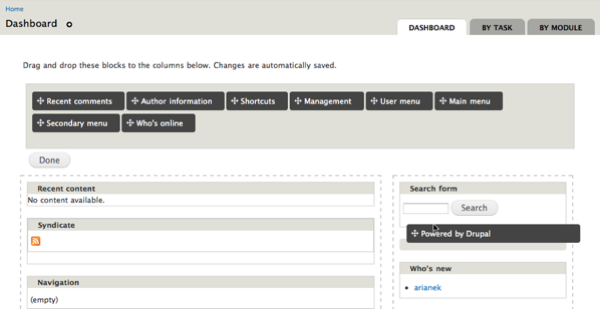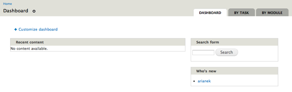 The finished dashboard blocks will fill with information as the site is populated with content and users.