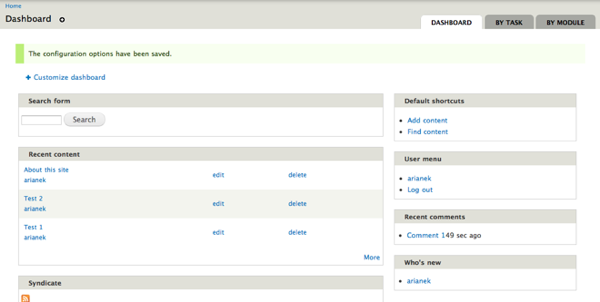 The dashboard gives administrators a customizable overview of important site information. You can add and remove items from the dashboard, or you can disable the dashboard completely.