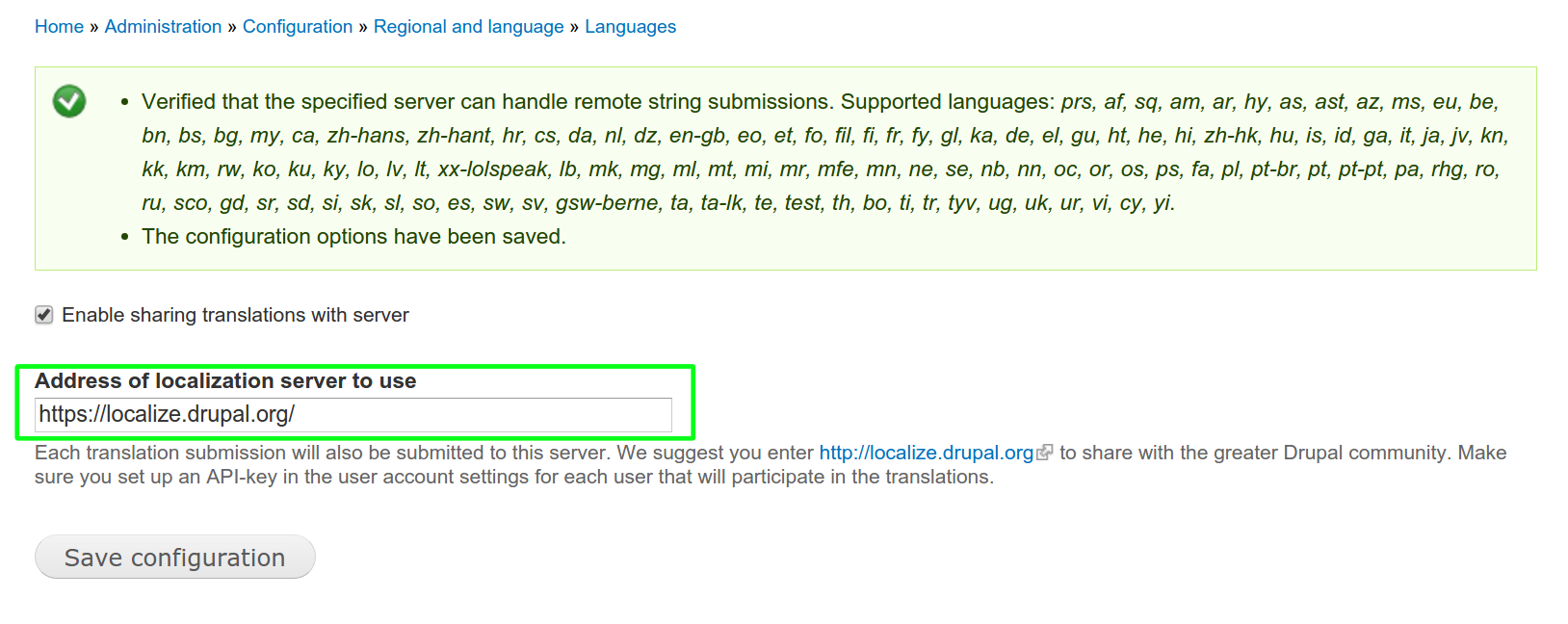 - In your site, go to the Configuration > Regional and Language > Languages > Sharing tab and enable sharing with localize.drupal.org by selecting the "Enable sharing translations with server" checkbox and saving the settings.