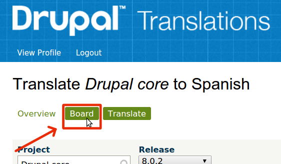 - Go to localize.drupal.org, sign in, search for your language and click on the Board tab