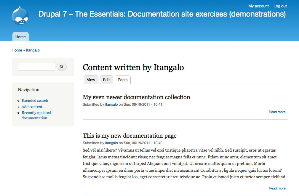 - Visit the user account page and click on the tab “Posts”. Verify that the documentation page is listed.