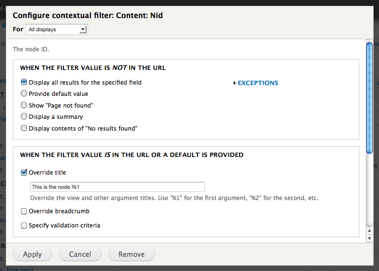 - Override title: This setting is used to alter the view's title, if there is a contextual filter value present. You may use variables in the form %1, %2, and so on, to include the first, or second filter values in the title (and so on). If there is any title element associated with the filter value, such as a node title for node IDs or user names for user IDs, the title element will be used - but only if the contextual filter is validated (see "Specify validation criteria" below). A typical use case is the title articles written by %1.