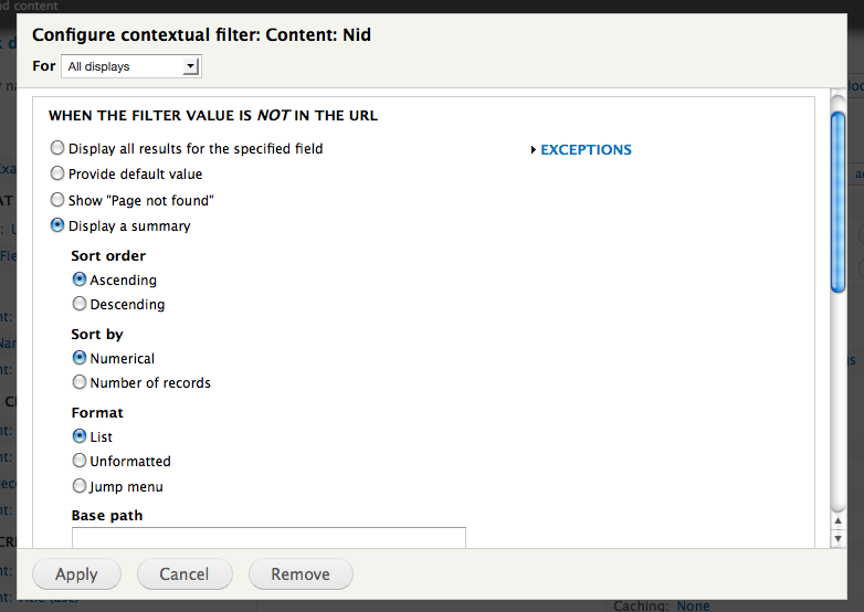 - More/exclude: This setting inverts the filtering. The rows matching the filter criteria will be excluded rather than included. A typical example is applying this to a node ID filter to exclude the node currently viewed from a list of similar content.
