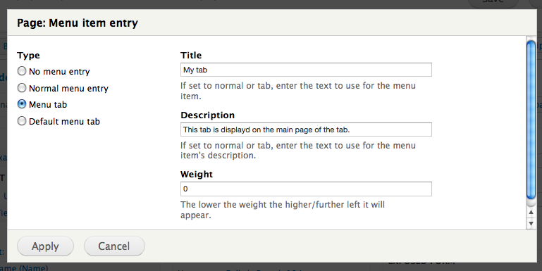 - In the main configuration panel, add a menu item of the type menu tab and give it the link text posts. Check here